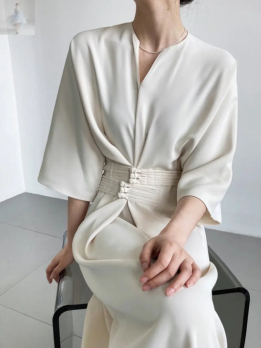 Premium Buckle Waist Lace Up Dress – V-Neck High Waist Women's Dress