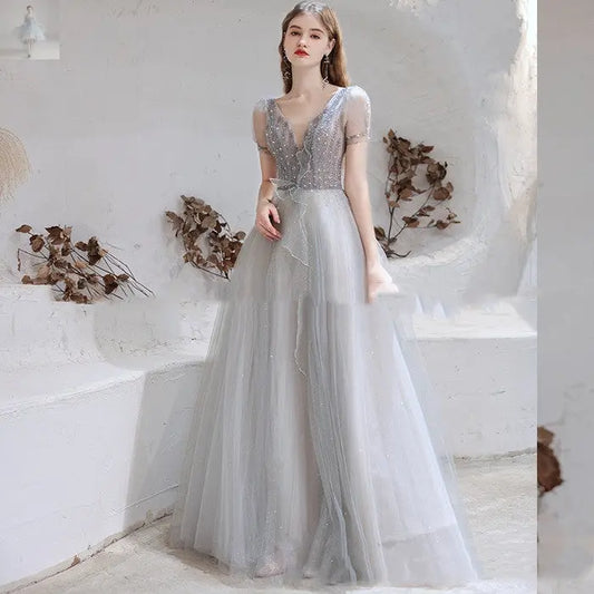Silver Paillette Engagement & Dinner Dress – High Waist Party Gown