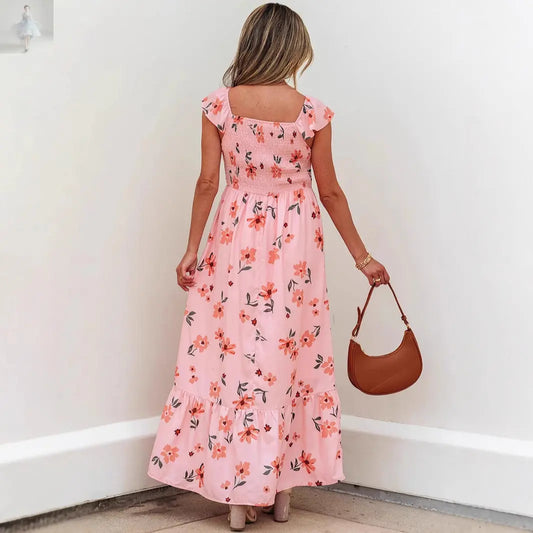 Women's V-Neck Floral Long Dress – High Waist Ruffled Summer Dress