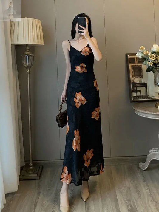 Women's French Vintage Floral Strap Dress – V-Neck High Waist Summer Dress